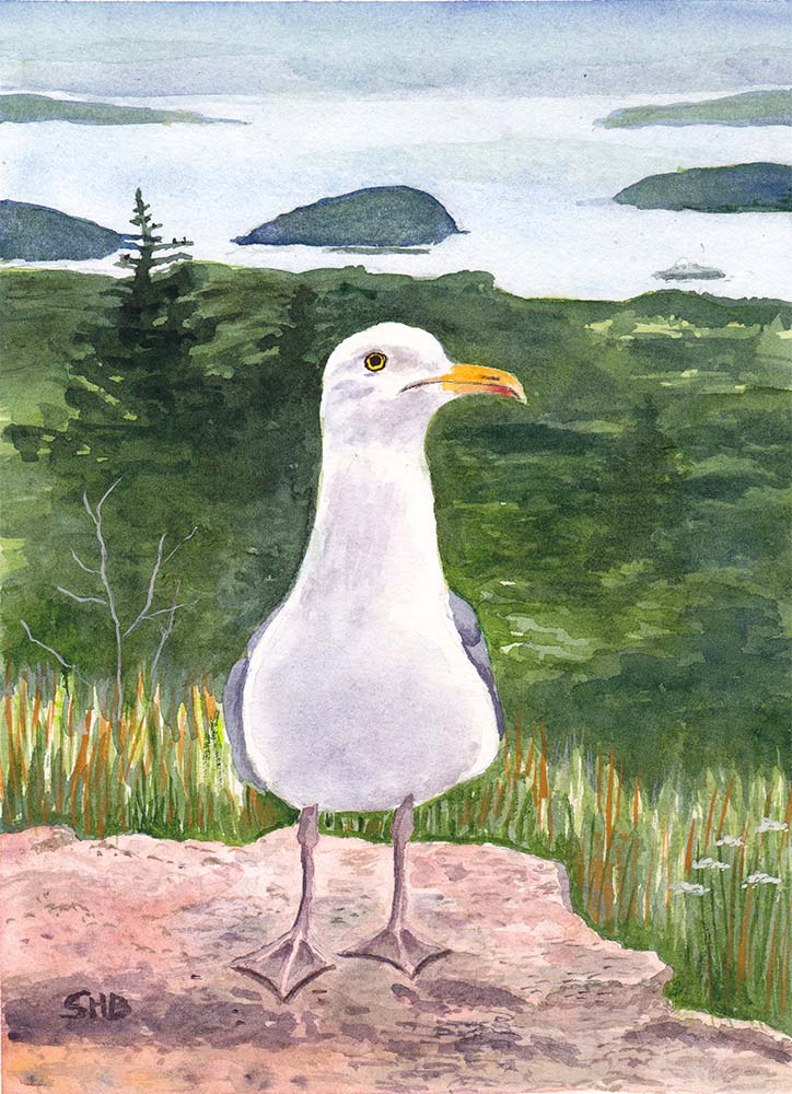 Suzanne Becque lives on Hancock Point. She is inspired by her surroundings, nature, trees, the ocean and magical views of the islands. She occasionally spends time in Mexico, and her work includes a few paintings of saints and angels influenced by her travels there.